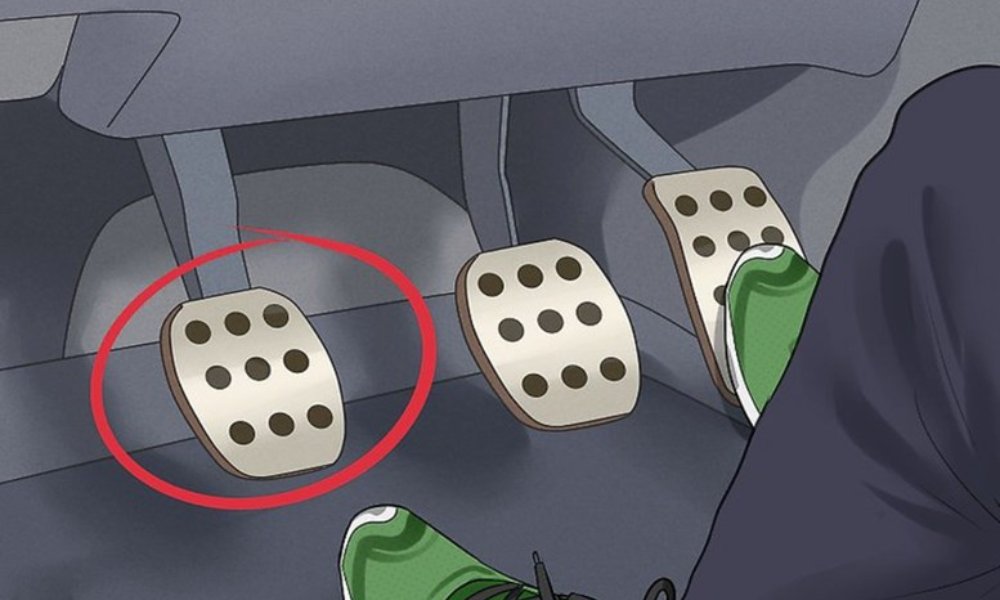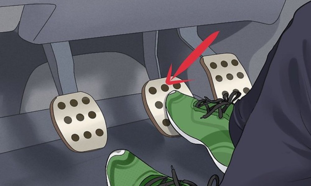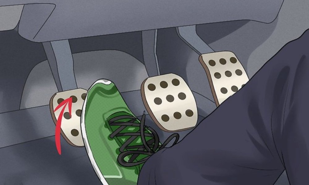 Bước 4: Nhấn giữ chân côn sát sàn. Giữ chân côn ở vị trí sát sàn để ngắt kết nối động cơ với hộp số.